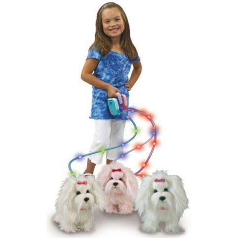 Великолепные щенки розового, белого и песочного цветов на светящемся поводке очень хотят погулять вместе с малышом!