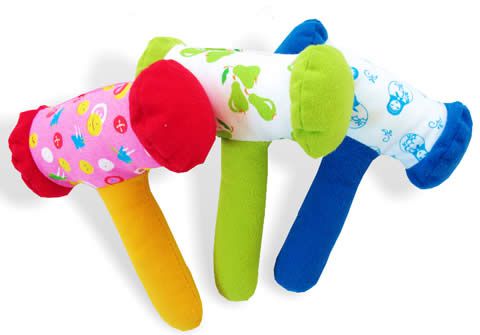 Большая мягкая погремушка в форме молоточка с длинной округлой ручкой, которую очень удобно держать малышу. Изготовлена из ярких разноцветных кусочков трикотажной и хлопчатобумажной ткани. Возможны различные комбинации цветов.